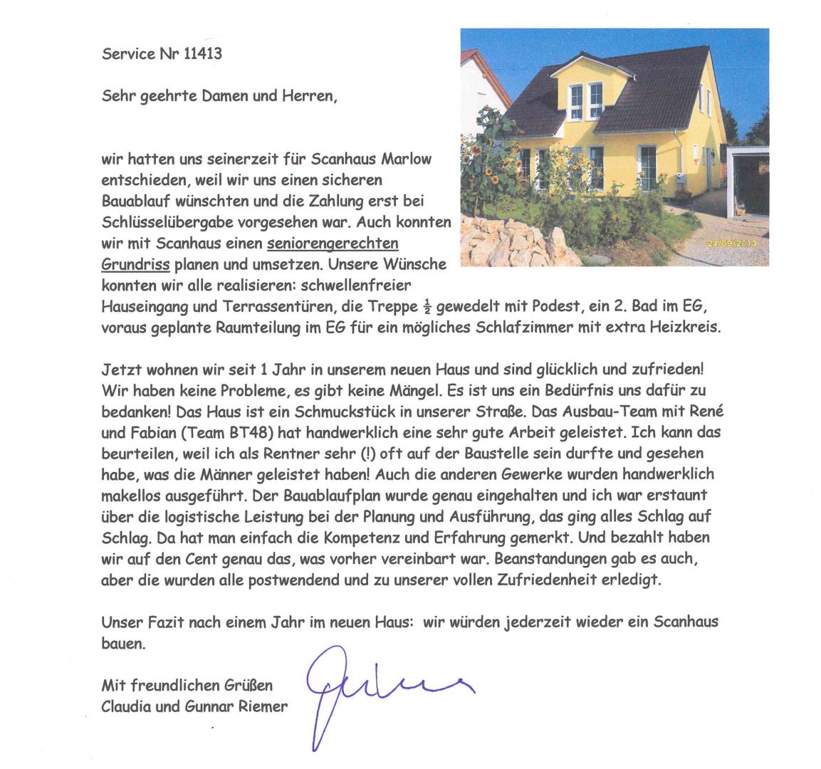 Wir sind froh, dass wir durch Ihre kompetente Beratung uns für die Firma ScanHaus Marlow entschieden haben und einen problemlosen Eigenheimbau von hoher Qualität erleben durften.