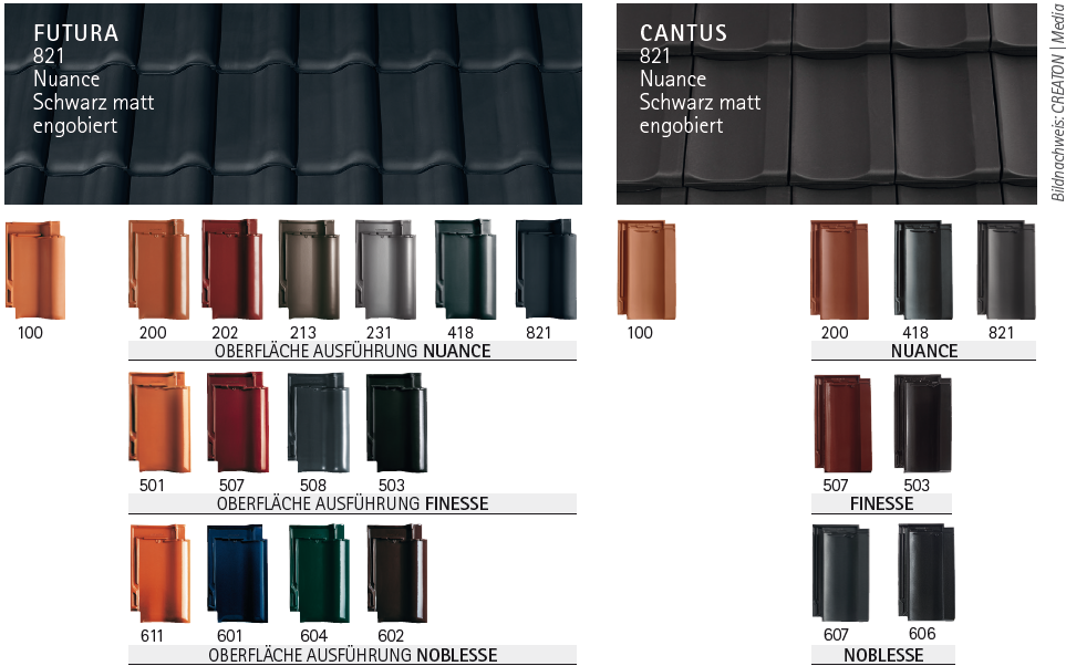 - Flachdachziegel Futura: Moderner und eleganter Look – ein Wechselspiel weicher Übergänge zwischen Licht und Schatten und bewirkt eine großartige Flächenwirkung
