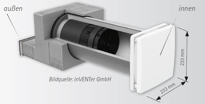 Unser Partner inVenter liefert die dezentralen Lüftungssysteme. Bei einem dezentralen Lüftungssystem übernehmen kompakte Lüftungsgeräte in den Außenwänden den Luftaustausch – raumweise steuerbar und ohne zentrale Rohrführung. Die Geräte wechseln im 70-Sekunden-Takt zwischen Zu- und Abluft. Dabei speichert ein integrierter Keramikwärmespeicher die Wärme der Raumluft und gibt sie zu rund 90 % an die Frischluft zurück. So entsteht eine kontinuierliche, energiesparende Belüftung – nahezu ohne Wärmeverlust und mit einem minimalen Stromverbrauch von nur 3 Watt pro Gerät.